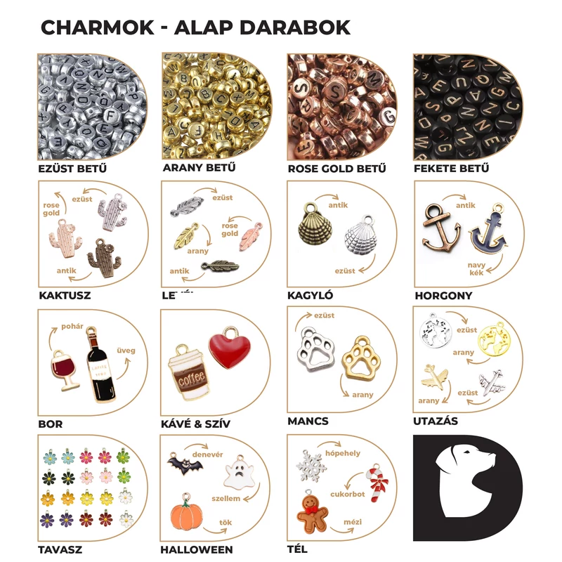 A kötél kulcstartóhoz maximum 2 db egyedi charm választható. A charmok mérete fajtánként eltérő (6 mm-20 mm). Amennyiben betű charmot választasz kérlek fizetéskor a megjegyzés rovatba írd be a kívánt nevet. A betűkészlet nem tartalmaz ékezetes betűket és maximum 6 karakter/betű hosszúságú lehet.